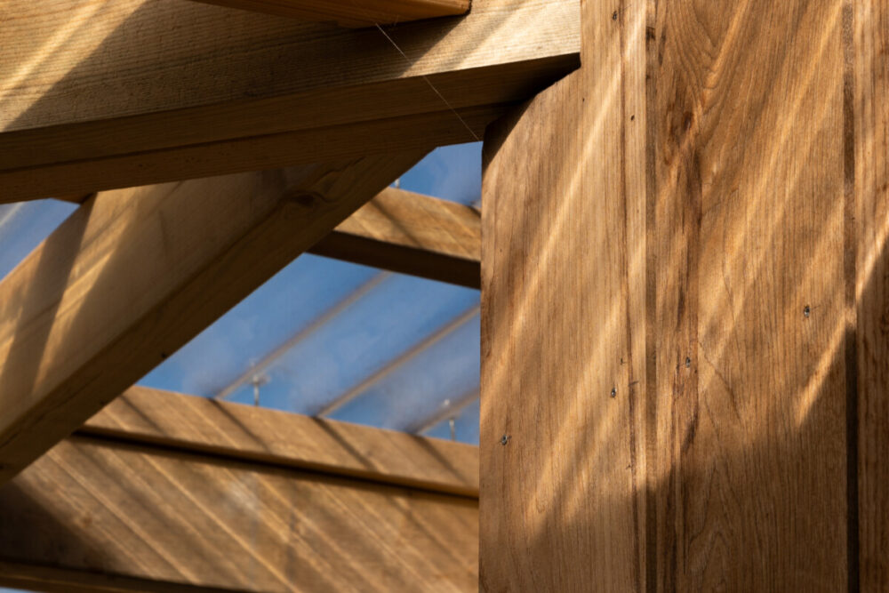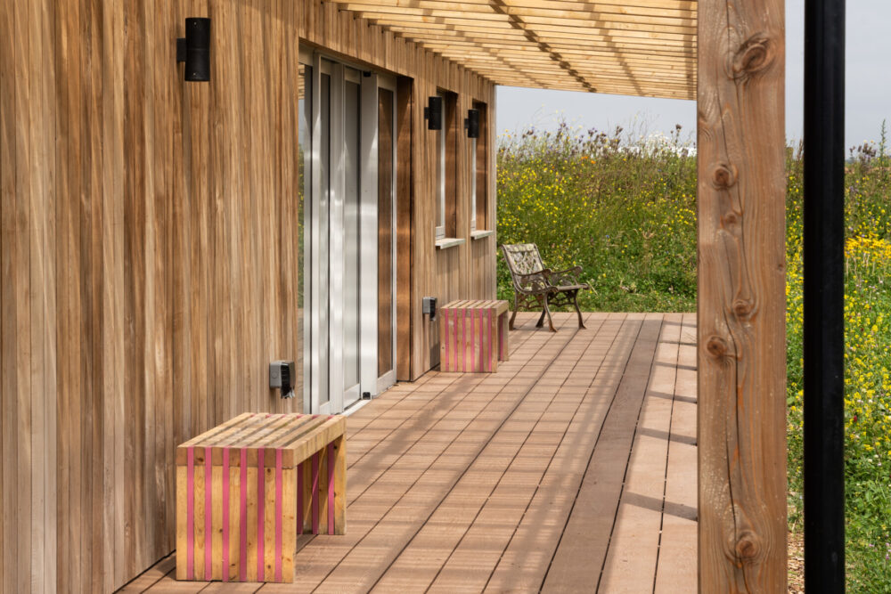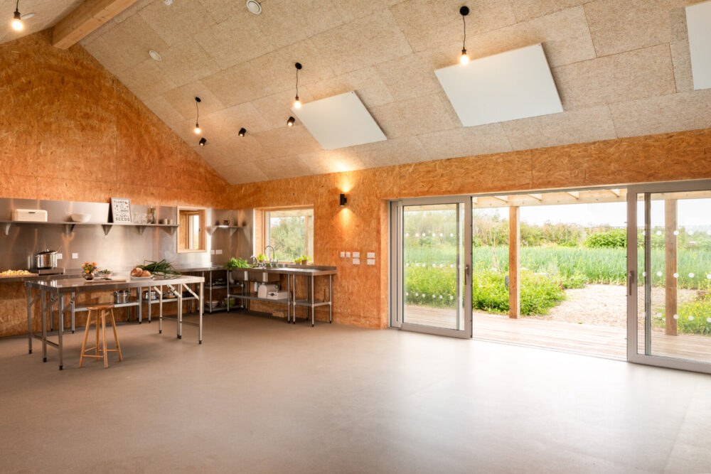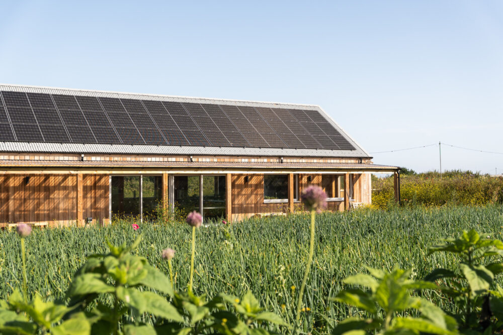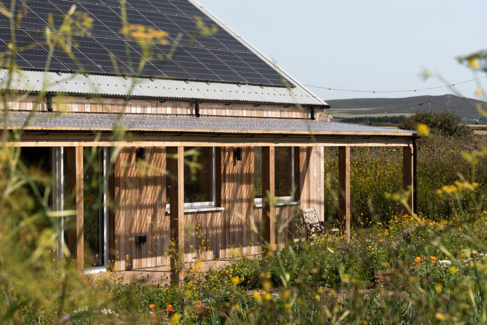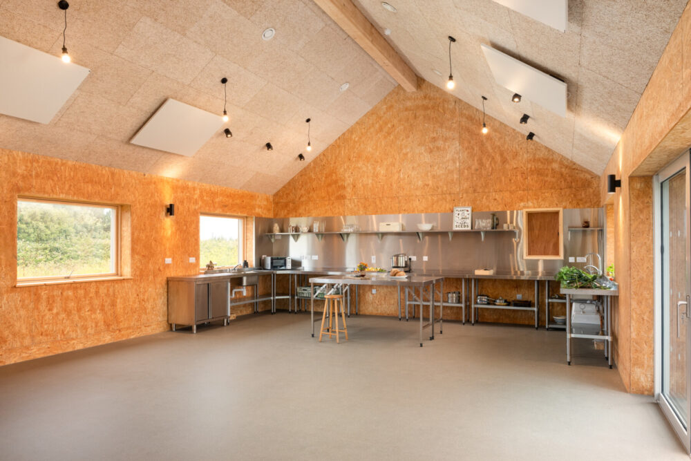 The simple barn-like form is fully timber framed and clad in UK grown thermally modified Ash, while the roof is finished in a profiled metal sheet with a full array of PV panels on the south facing side. The highly insulated and air-tight building has been designed to ensure it provides a year-round comfort and low running costs for its users.